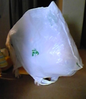 置いてあったビニール袋に興味を持っったため、先生から袋を被せられ